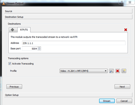 By clicking the drop down menu to select “RTP/MPEG Transport System” & then click “Add “ button next to the drop down menu. If you want to watch the video locally while streaming click “Display locally” checkbox.