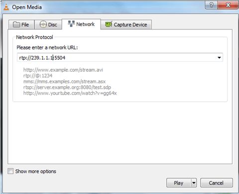 Then type “rtp://239.1.1.1:5004” in “Please enter a network URL section”. Your can watch your video from the Laptop 2. If you used a different udp port use that number instead of default 5004.