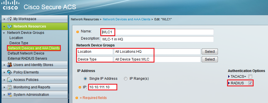 You can add WLC into ACS in ” Network Resources > Network Devices & AAA clients” section. You can create “Location”, “Device Type” if required in order to restrict the access based on those criteria. I have used previously created “HQ” & “WLC” location & type field in the below configuration.PEAP-FAST-02