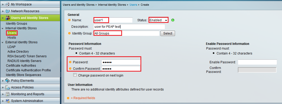 Then you need to create users in ACS for this test. I have created “user1” with password “user1” for PEAP method & “user2/user2” for EAP-FAST method.You can create users in “Users & Identity Stores > Users” section. In here as well you can create Identity Groups if you want to differentiate users. I have used default “All Groups” as identity group. Since these users not accessing any network devices I have not configured enable password for them.