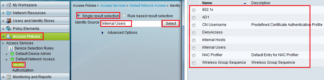 Finally you need to ensure “Identity” section in Default Network Access section is configured to use “Internal Users” as we configured users locally in ACS. By click “Select” option you can choose any other available sources.(See below)