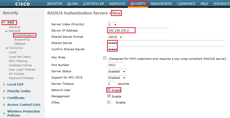 Then you need to configure WLC. First you have to add RADIUS severer to WLC & then define the two WLANs by creating the required interfaces. Below screen show how you can add RADIUS server into a WLCPEAP-FAST-10