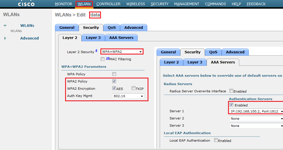 In “data” WLAN you have to select configured RADIUS server under security tab. Other settings shows are default configurations.PEAP-FAST-12