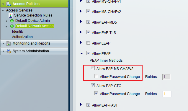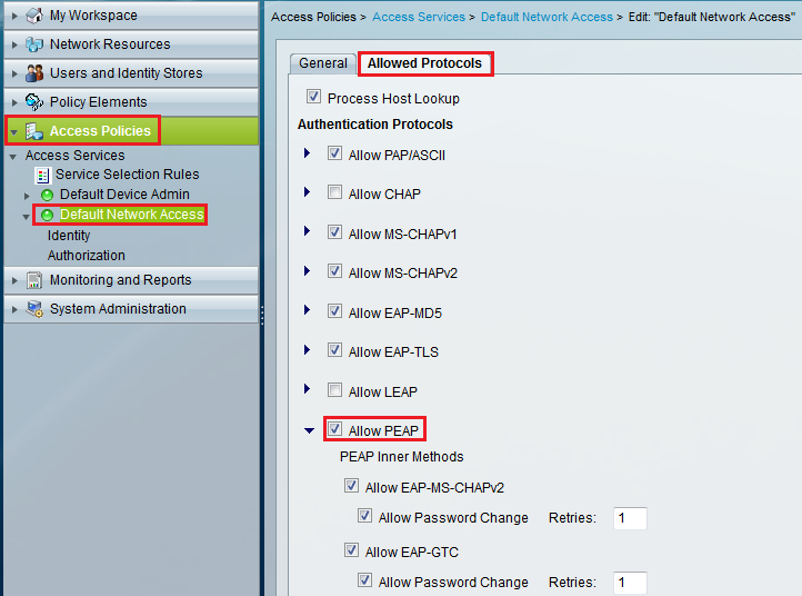Finally you need to apply some access policy  under ” Access Policies > Default Network Access” Section. First of all you need to verify EAP-FAST & PEAP is selected as allowed protocol in ACS 5.2 in this section.PEAP-FAST-61PEAP-FAST-62