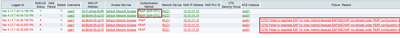ACS5.2 Reporting view also can be used to verify the Authentication mechanism. Notice that failure reason given PEAPv0-MSCHAPv2 is not enabled in ACS when I tried to connect PEAPv0.PEAP-FAST-22
