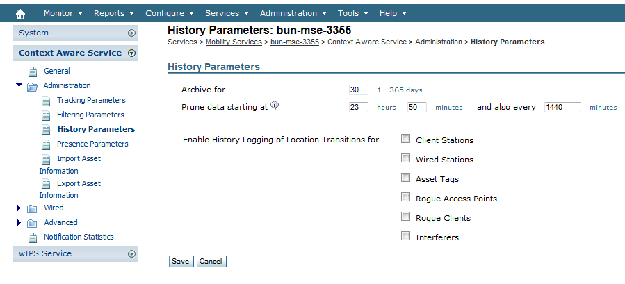in WCS under “Services-> Mobility Services -> Context Aware Services->Location Parameters“, you can change location specific information. An element is declared “inactive” if it is remain inactive for 1 hour.If it remain inactive for 24 hours (Absent Data Cleanup Interval) it is removed from the tracking table. But element’s history will be in MSE for 30 days by default.