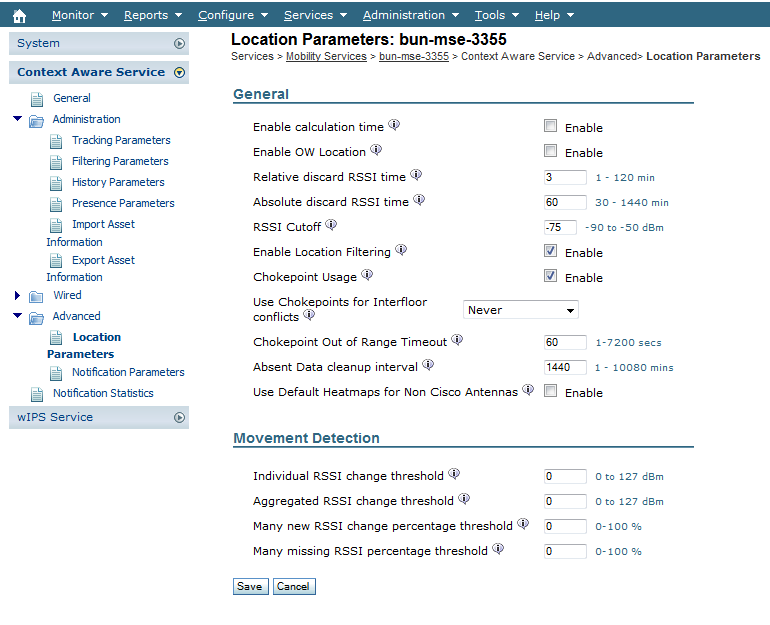 The RSSI Cutoff is an important field that can be tuned for a particular environment. This field specifies the minimum RSSI value below which the MSE ignores when it calculates the location for a given element. This value is only applicable to track clients, that is, it does not apply to tag tracking.