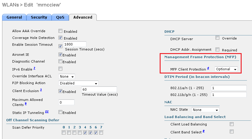 You can disable or re-enable infrastructure MFP per AP level as well. To do this you have to go to Advanced tab of a particular AP (Wireless -> Access Points -> All APs -<AP_Name> Advanced”) by tick or untick ” MFP Frame Validation”.