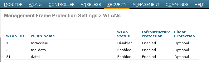 Once you configure MFP you can verify settings by using ” Security -> Wireless Protection Policies -> Management Frame Protection -> General” section.