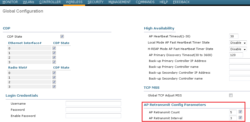 1. Configure the retransmission interval and retry count for all APs globally by entering this CLI command. Interval is a value between 2-5s where as count is a value 3-8.