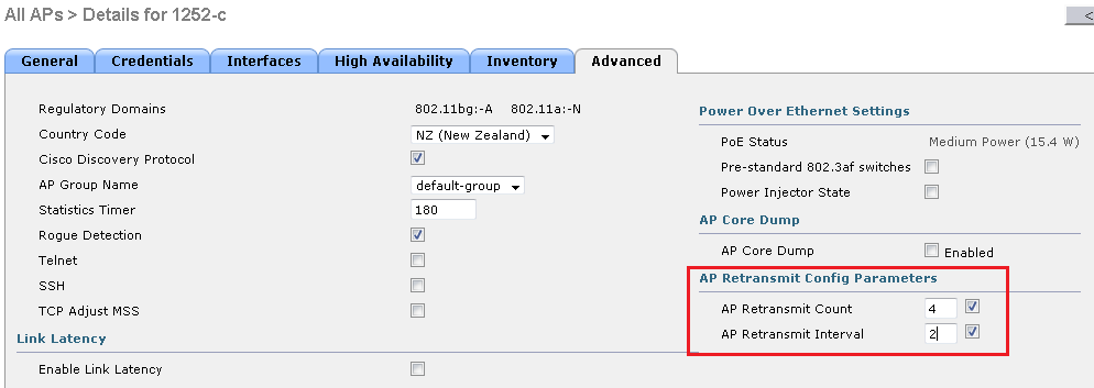Under AP advanced setting page you can configure these values for a given AP. That settings will supersede the global settings if configured. Below shows 1252-c AP configured for 2s retransmit interval & retry count of 4.