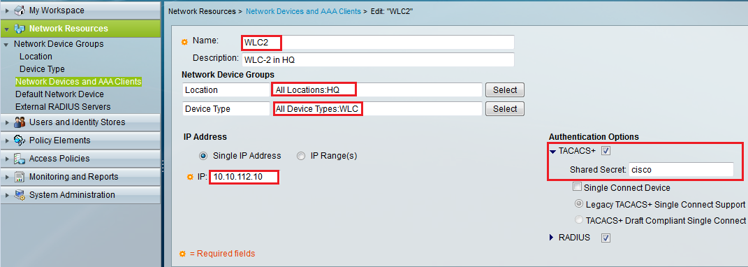 In ACS first you have to add your WLC ( in Network Resources -> Network Devices & AAA Clients section as shown below. You can create Location Group & Device Type group if you require more granular conditions in later on. I have created “HQ” location group & “WLC ” Device type group for this. Used the same shared secret key used for WLC.