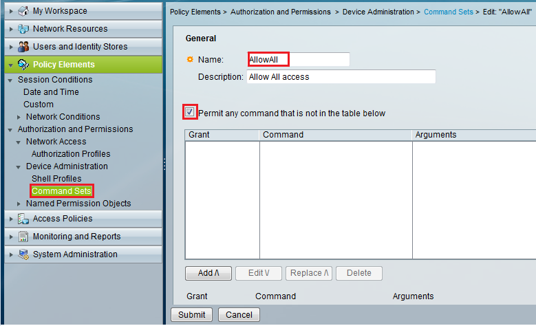 In the same section (Device Administration -> Command Set) you have to create a commnad sets. But in here we allow all TACACS commands since shell profile we created limited the user scope.