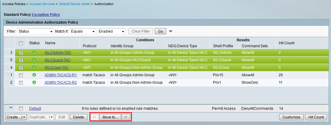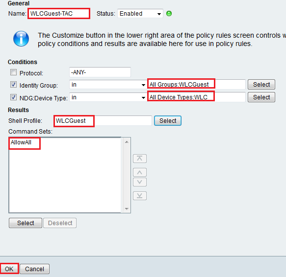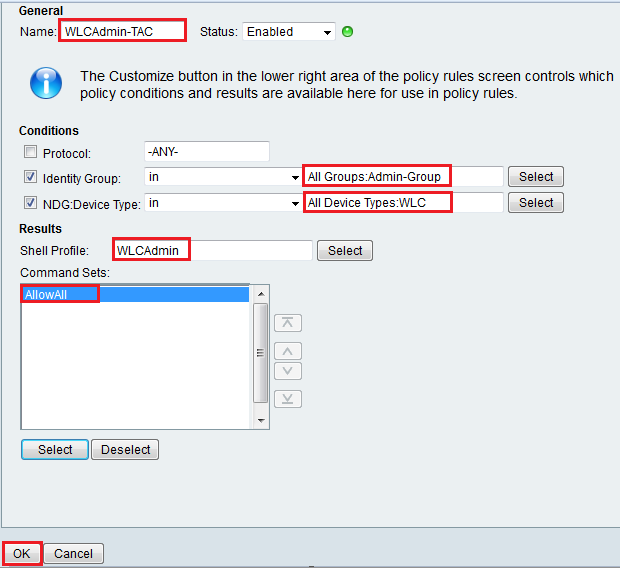 Now you can define rule set for each type of users request. For WLCAdmin rule, you can match TACACS request coming from “WLC” device group where users belong to “Admin-Group”. Once this condition match it will select “WLCAdmin” shell profile you created in the early step.