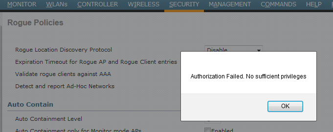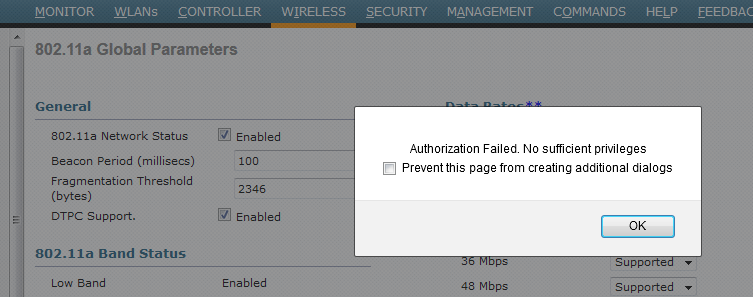 But if you log in as WLCUser called “mrnuser” you can modify any settings under WLAN & WIRELESS tab of WLC. But if you try to modify any setting otherthan these two you will get the similar error message.