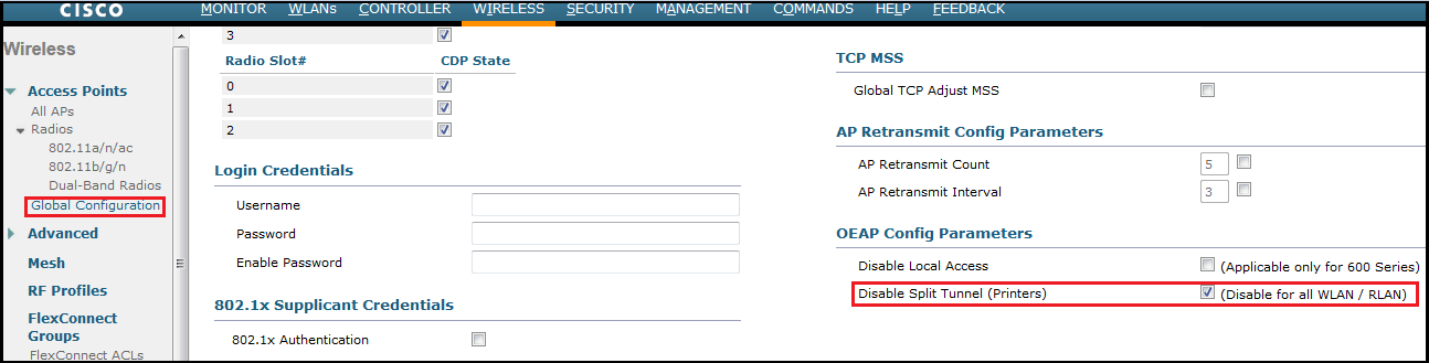 disable        Disables Split Tunnel State (Printers) for OEAP-600 connecting to this controller