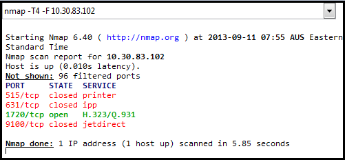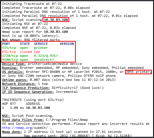Now Split Tunneling is there in your OEAP600 series AP. Once you connect to corporate SSID (which is enabled with Split Tunnel) you can reach any device connect to your OEAP personal SSID or Local LAN ports. So if you want to print, then you have to move your printer back to OEAP local port. I have connected my printer to OEAP LAN port (got an IP 10.30.83.100), then while I am connecting to my corporate SSID (131.x.x.9) I can reach the printer. Here is then nmap scan for printer while I am on corporate SSID. You can see only limited ports are open.