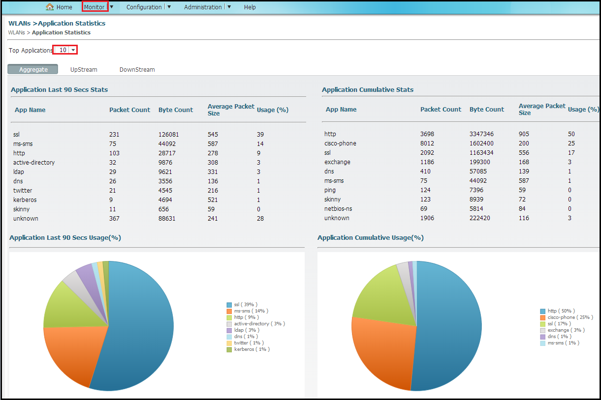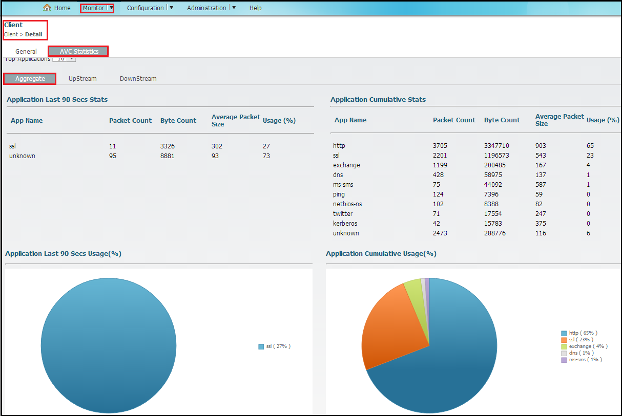 Now you can see this AVC statistics for WLAN (Monitor -> Controller -> AVC -> WLAN) or specific client (Monitor -> Client -> MAC address -> AVC statistics) as shown in the below two snapshots. You can monitor them in “Aggregate”, “Upstream” or “Downstream” fashion.