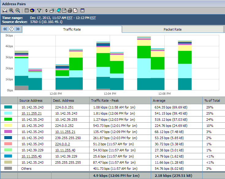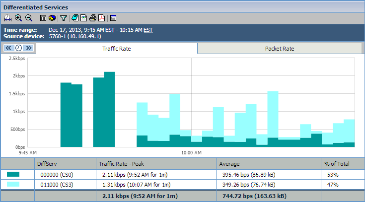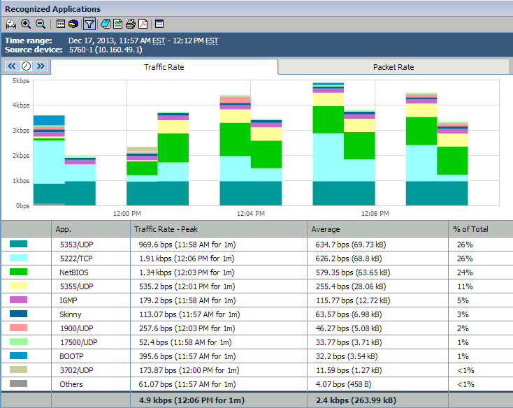 5760-1#show avc wlan LTUWireless top 10 application upstream Cumulative Stats: No. AppName Packet-Count Byte-Count AvgPkt-Size usage% ------------------------------------------------------------------------------------------------------ 1 cisco-phone 41554 8310800 200 86 2 unknown 6191 597761 96 6 3 netbios-ns 1883 147738 78 2 4 dns 1321 84277 63 1 5 http 1313 105422 80 1 6 ssl 1135 209462 184 2 7 exchange 615 150475 244 2 8 skinny 508 31837 62 0 9 rtcp 170 19480 114 0 10 icmp 108 24752 229 0 Last Interval(90 seconds) Stats: No. AppName Packet-Count Byte-Count AvgPkt-Size usage% ------------------------------------------------------------------------------------------------------ 1 cisco-phone 4179 835800 200 99 2 unknown 88 9164 104 1 3 rtcp 17 1972 116 0 4 skinny 5 296 59 0 5760-1#show avc wlan LTUWireless top 10 application downstream Cumulative Stats: No. AppName Packet-Count Byte-Count AvgPkt-Size usage% ------------------------------------------------------------------------------------------------------ 1 cisco-phone 46427 9285400 200 68 2 http 2392 3242288 1355 23 3 ssl 1327 1077406 811 8 4 unknown 602 205696 341 1 5 exchange 584 50010 85 0 6 skinny 342 29308 85 0 7 dns 195 37018 189 0 8 ping 63 3746 59 0 9 twitter 41 9206 224 0 10 ms-sms 40 27476 686 0 Last Interval(90 seconds) Stats: No. AppName Packet-Count Byte-Count AvgPkt-Size usage% ------------------------------------------------------------------------------------------------------ 1 cisco-phone 4178 835600 200 100 2 skinny 3 180 60 0 5760-1#show avc client 2c54.2dea.f4ea top 10 application aggregate Cumulative Stats: No. AppName Packet-Count Byte-Count AvgPkt-Size usage% ------------------------------------------------------------------------------------------------------ 1 cisco-phone 47544 9508800 200 100 2 skinny 157 13104 83 0 3 icmp 107 24396 228 0 4 rtcp 85 9860 116 0 5 unknown 19 1052 55 0 6 dhcp 9 3448 383 0 7 ping 1 48 48 0 Last Interval(90 seconds) Stats: No. AppName Packet-Count Byte-Count AvgPkt-Size usage% ------------------------------------------------------------------------------------------------------ 1 cisco-phone 9000 1800000 200 100 2 rtcp 17 1972 116 0 3 skinny 13 772 59 0