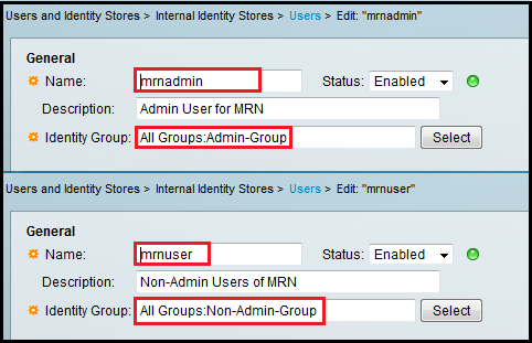 Then create the two users and assign them to the groups created above. You can do this via “Users & Identity Stores -> Internal Identity Stores -> User ” section as shown below