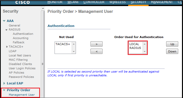 You have to select priority order ” Local” & then ” RADIUS” to ensure that you will not be lock yourself out in case of wrong configuration with radius. Unless RADIUS server is unreachable you cannot fall-back to local.