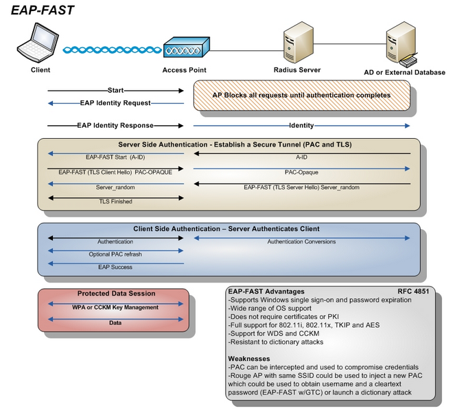 EAP-FAST (Flexible Authentication via Secure Tunneling) initially developed by Cisco. Later in 2007, IETF ratified this in RFC 4851. Cisco developed this as replacement for LEAP. EAP-FAST provide both mutual authentication & tunnelled authentication without using standard based X.509 digital certificate to create TLS tunnels, instead use PACs (Protected Access Credentials)