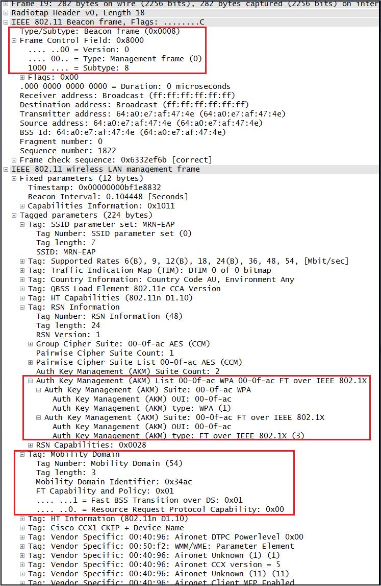 Here is a detail view of a Beacon Frame send by AP. As you can see in included additional information element (Mobility Domain Information Element –MDIE) which is used to indicate the existence of a mobility domain as well as the FT transition supported. This IE has following fields (size in bytes shown within bracket)