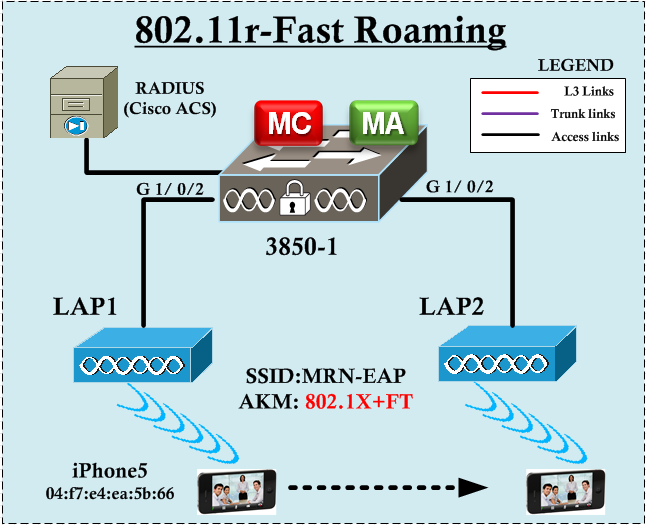 In this post we will see how 802.11r supported client first associate to an SSID configured for 802.11r FT support. I have used 3850 (running on IOS-XE 3.6) as my WLC. Not all wireless clients support 802.11r, so you have to select a client supporting this standard. Most of the Apple idevices support 802.11r & you can find the complete list from this link. So here is my topology for this post.