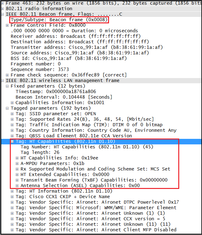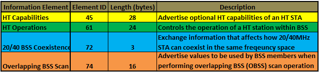 802.11n introduces 4 new information elements which can be seen in 802.11n (HT) beacon frames.