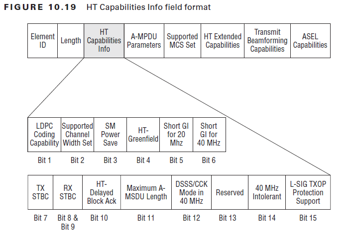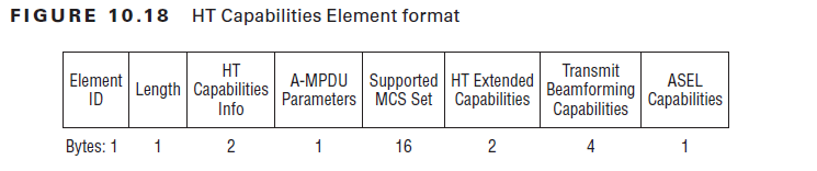HT STAs declare themselves as HT STA by transmission of HT Capabilities Element in Beacon, Probe Request, Probe Response, Association Request, Association Response, Reassociation Request & Reassociation Response frames. Below diagram shows the format of HT Capabilities Information Element.(page 383- CWAP Official Study Guide)