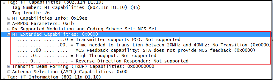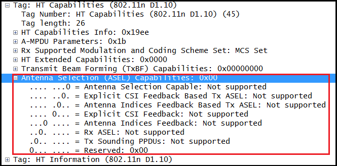 Here is a Beacon frame capture shows these filed of HT capabilities IE.