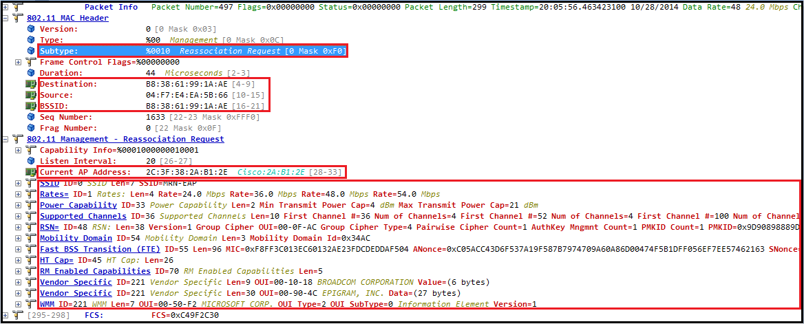 Here is the Reassociation Request send by iPhone5. It is a management frame with subtype 2. Note that it will ist the Current AP Address (LAP2- B8:38:61:99:1A:AE) STA is associated to.  STA can be associated to ONE AP at any given time where as it can be authenticated to multiple AP. Note that FTE & MDIE information element is there because BSS is configured for 802.11r FT.