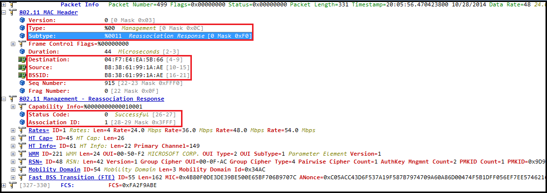 CWAP-ReAsso-04Then AP will respond with Reassociation Response frame. It is a management frame with subtype 3. Depend on the information provided in Reassociation Request, AP may or may not be allow STA to join. In given scenario status code=0 implies a successful reassociation & AID is given for the client (AID=1 in my case).