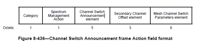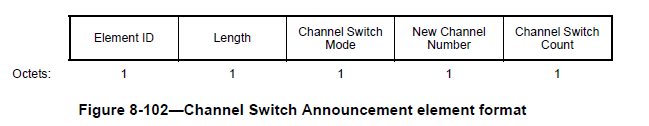 The Channel Switch Announcement element is used by an AP in a BSS, a STA in an IBSS, or a mesh STA in an MBSS to advertise when it is changing to a new channel and the channel number of the new channel. The format of the Channel Switch Announcement element is shown below (source IEEE 802.11-2012)