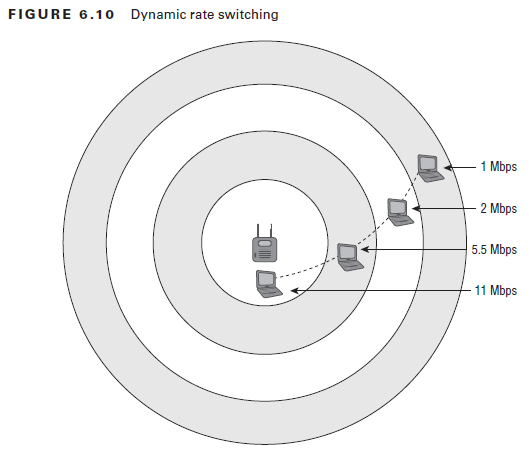 In simple terms as client station radios move away from an access point, they will shift down to lower bandwidth capabilities by using a process known as dynamic rate switching (DRS). Access points can support multiple data rates depending on the spread spectrum technology used by the AP’s radio card. Below diagram shows HR-DSSS (802.11b or Clause 18) AP client dynamically shift rates based on the signal quality (RSSI, SNR) it receive from the AP.