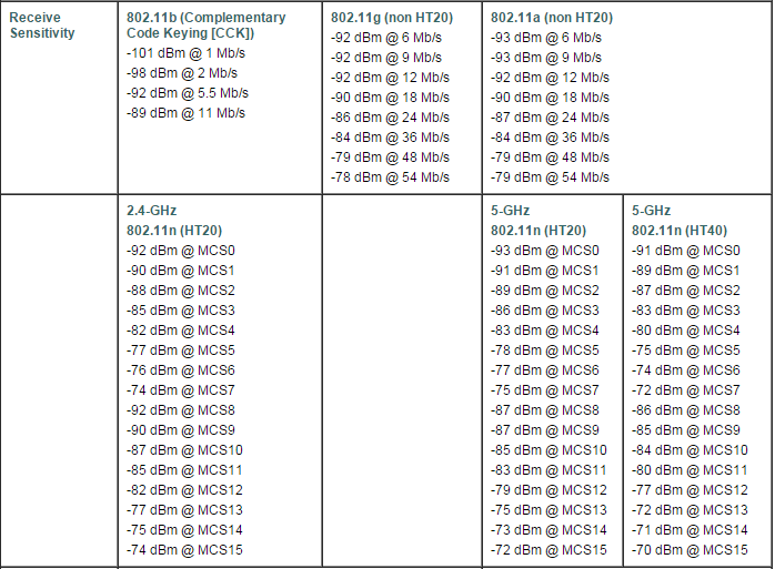 Here is an example for Cisco 1262 AP receive sensitivity details listed in the AP specs.