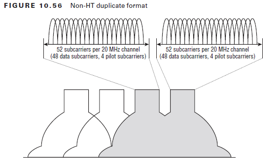 When protecting the transmission of 40 MHz HT frames against clause 17 (OFDM) radios and clause 19 (ERP) radios, protection mechanism control frames can be sent over the 40 MHz channel using non-HT duplicate transmissions. Non-HT duplicate transmissions allow the two identical 20 MHz non-HT control frames to be transferred simultaneously on both the primary and secondary channels as shown below (CWAP Study Guide – page 422).