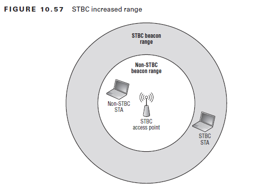 When implementing STBC, the received signal may be improved by up to 8 dB, resulting in greater range shown in the below figure (CWAP- Page 423). An 8 dB increase in signal strength can yield up to 69 percent more range. This increased range will only apply to STBC frames and therefore does not automatically mean an increased BSS size for all STAs.