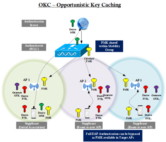 In the first module, we will discuss the basics of client roaming triggers, and how you capture frames in the client roaming scenario, details of frame flow in Open/ PSK/ 802.1X client roaming. Then finish off that module by discussing common Key caching methods (PMKCaching & Opportunistic Key Caching – OKC). Below shows a high-level comparison diagram of those two Key Caching Methods.