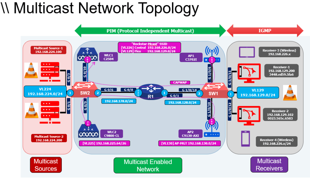 We are using a basic multicast network topology shown below for this digital course. We will start demonstrations with Unicast video transmission first and then onto wired multicast. Later we do lab demonstrations on wireless multicast using Cisco Wireless environment. First with AireOS based (2504WLC/3702AP) and then look at IOS-XE based (9800WLC/9130AP) infrastructure.