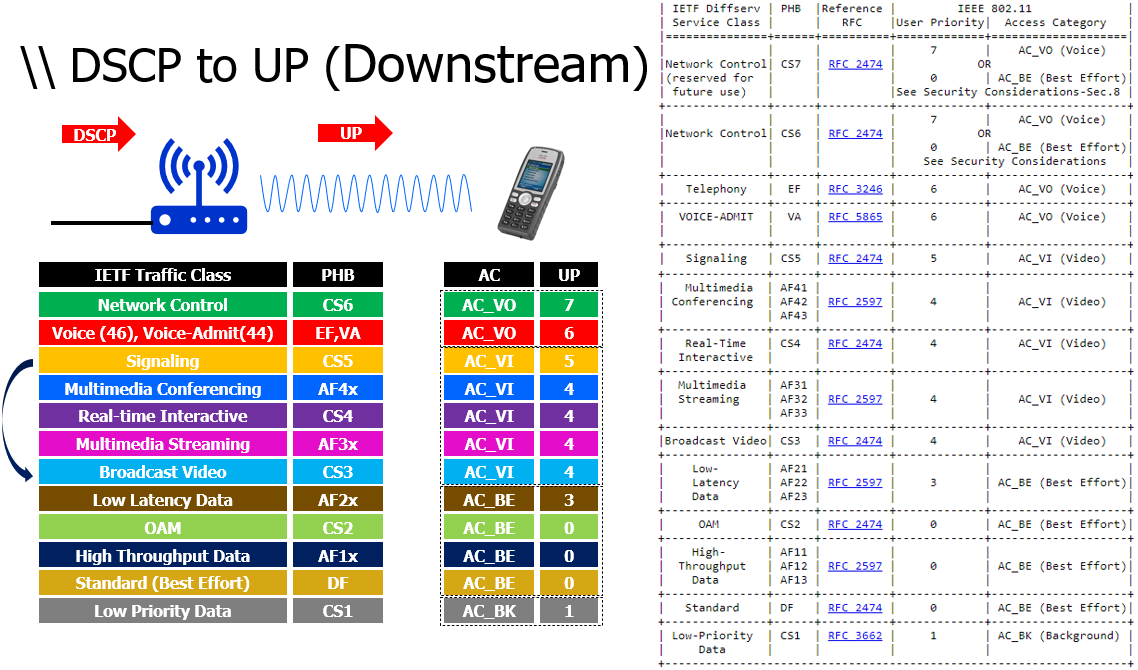 In the next post let’s look at how we can use “Business Relevance” & “Traffic Class” attribute to define a custom QoS policy in 9800. In that way, you can re-classify your business relevant application traffic on SSID level with proper DSCP that closely match RFC8325. (Above diagram shows downstream direction, however classification policy on SSID level is more important in upstream direction)