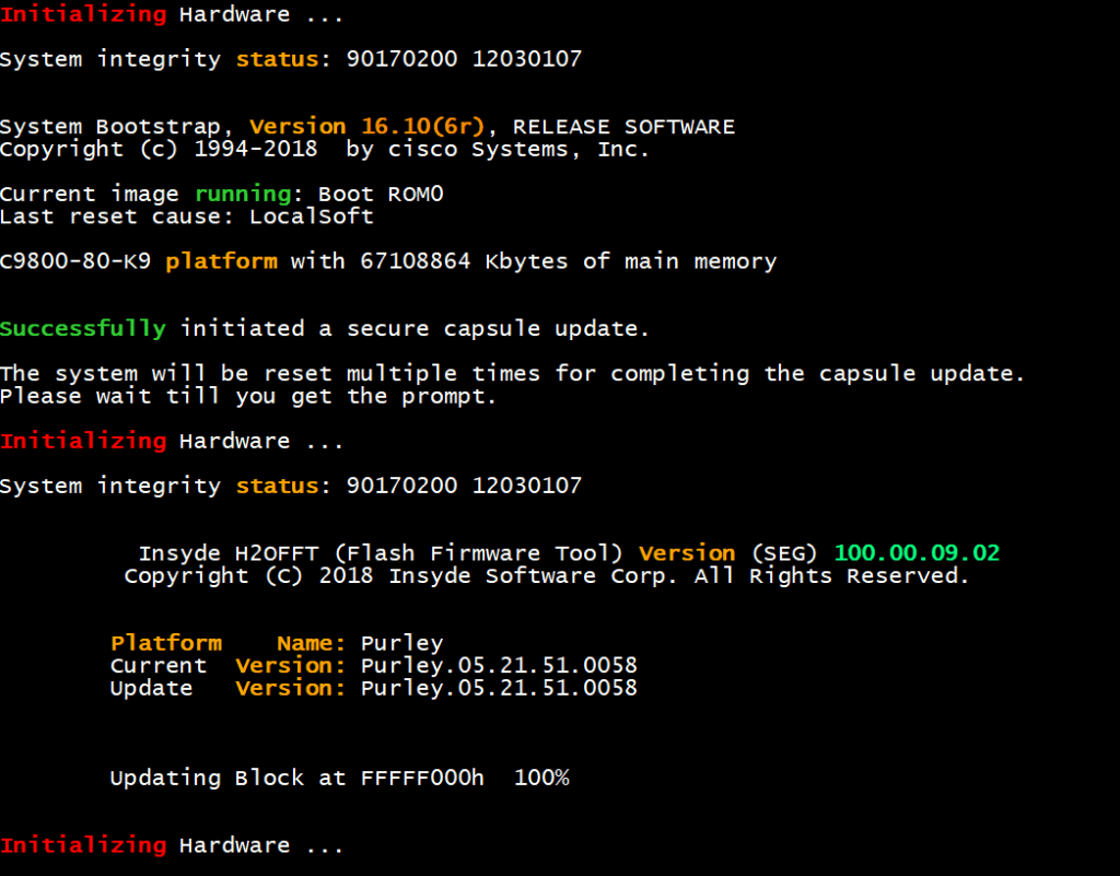 Here is the output while reloading the previous active unit. Note that ROMMON update is termed as “secure capsule” update a new term to remember :). Usually, this process takes around 10min.