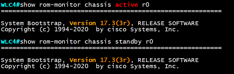 WLC4#upgrade rom-monitor filename bootflash:C9800-80-rommon.173-3r.pkg chassis active r0 Verifying the code signature of the ROMMON package... Chassis model C9800-80-K9 has a single rom-monitor. Upgrade rom-monitor Target copying rom-monitor image file Secure update of the ROMMON image will occur after a reload. 131072+0 records in 131072+0 records out 131072 bytes (131 kB, 128 KiB) copied, 0.658038 s, 199 kB/s Copying ROMMON environment 131072+0 records in 131072+0 records out 131072 bytes (131 kB, 128 KiB) copied, 0.974933 s, 134 kB/s 131072+0 records in 131072+0 records out 131072 bytes (131 kB, 128 KiB) copied, 0.981465 s, 134 kB/s ROMMON upgrade complete. To make the new ROMMON permanent, you must restart the RP.