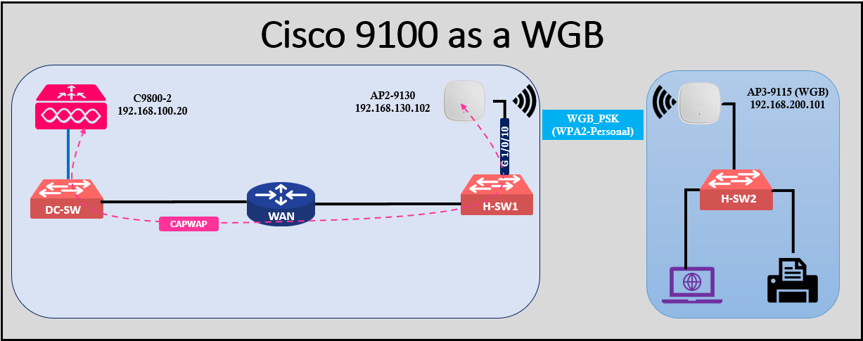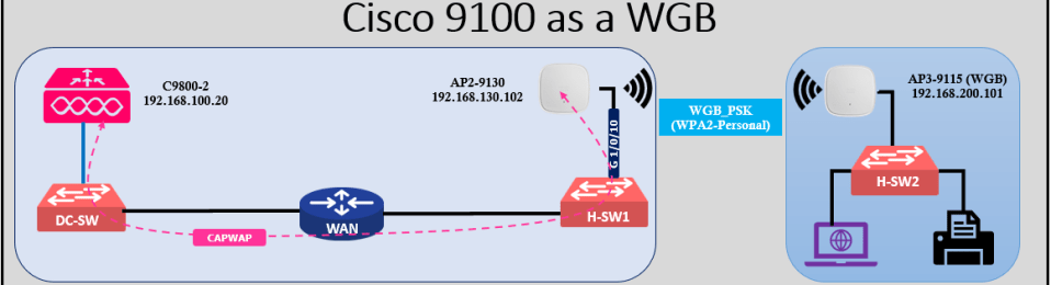 Here is my test topology for this post. (We will look at the basic config of WGB in this post & do a separate post on additional WGB configurations for wired devices)