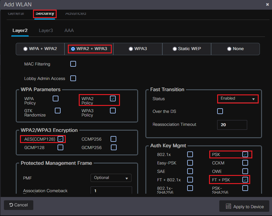 For WGB to work, you have to enable “Aironet-IE” under WLAN profile “Advanced” configurations in a 9800. (In AireOS, specific WLAN -> Advanced settings). My SSID is configured with PSK (AKM 2) & FT+PSK (AKM 4) as shown below.
