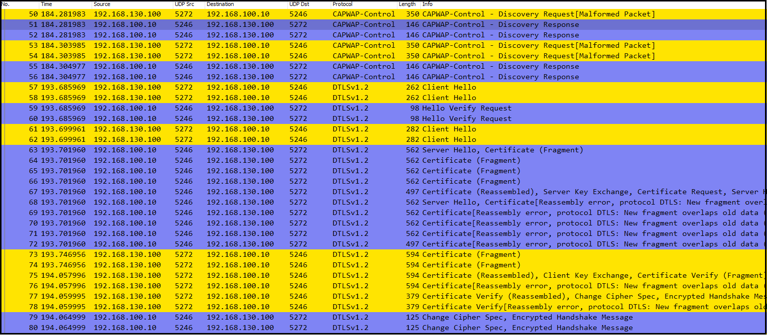 Here is the AP-Registration PCAP for you to check. Below is the summary of the frame flow during DTLS establishment. This example, it is showing a flow of the working AP. When you have AP join issues, you will see failures occurring DTLS session establishing due to time, country code, trust points, etc.