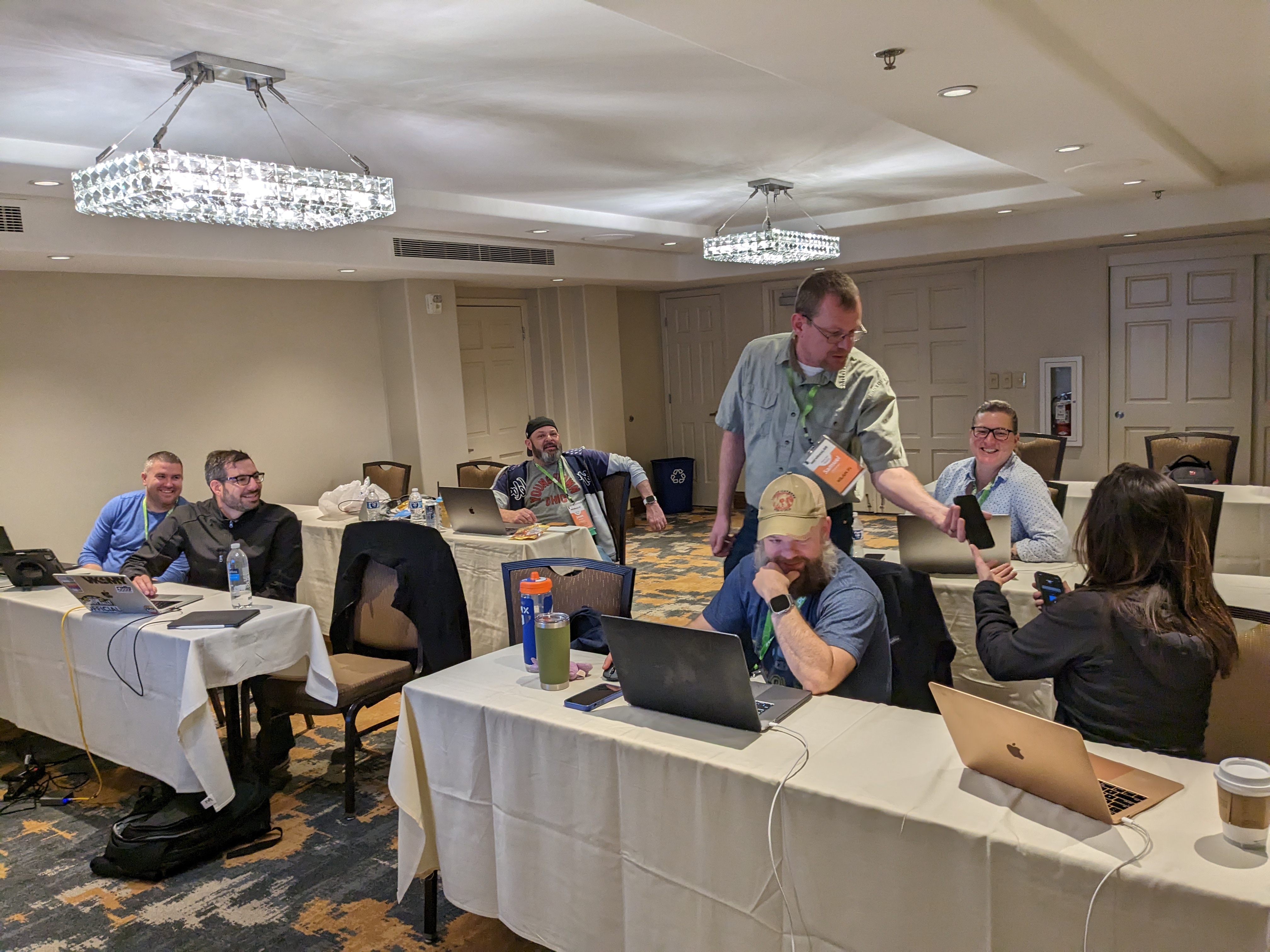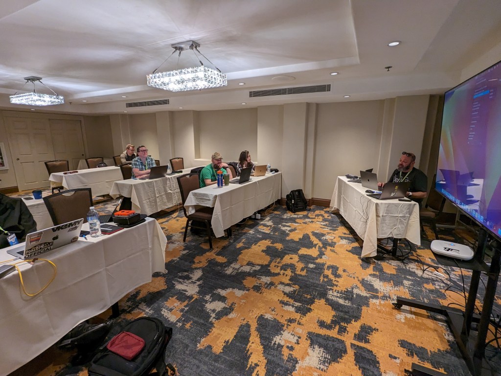 The class was well-received and we had a lot of interactive conversations. Students got a lot of time to go through frame analysis and live demos & taking PCAPs during the class. We had a simple lab setup shown below where two live APs in the class (one client serving & one in sniffer mode) to facilitate those live demos and allow students to take PCAPs.