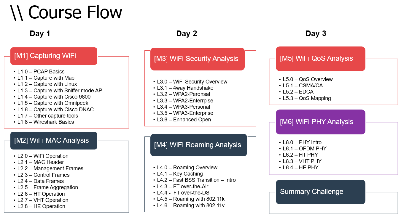 I am back at home after another successful WLPC (the best wireless conference) event in Pheonix USA. It is a special one for me as I delivered a 3-day bootcamp using my own content (Rockstar Wireless Analysis) that I developed for WiFi Training. As it is an instructor-led version I included a lot of live lab exercises for students to get them comfortable with wireless frame analysis. Here is the ILT course flow.