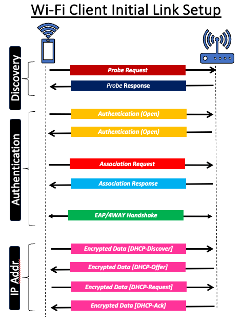 In this post, we will explore FILS – Fast Initial Link Setup, which was originally defined in IEEE 802.11ai in 2016 and later incorporated into the IEEE 802.11-2020 main standard. A Wi-Fi client connecting to an AP has to go through the Discovery, Authentication/Association, and IP Addressing process as shown below.