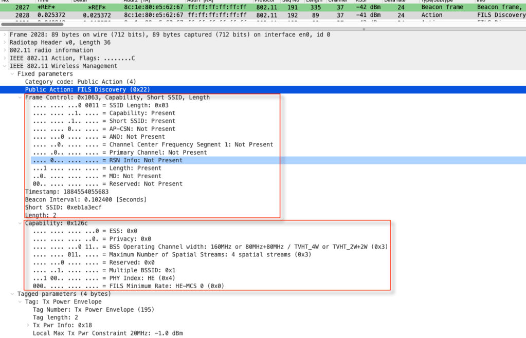 Here is a PCAP of Cisco AP that enabled FILS discovery on the 6GHz band. As you can see FILS discovery messages are broadcast by AP in ~20ms intervals.
